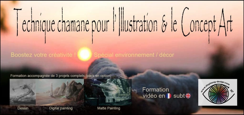 Cette méthode, j’ai décidé de la partager pour aider les illustrateurs et concept artistes à ne plus jamais manquer d’imagination… c’est naturellement devenu le sujet de la première formation de mon école en ligne. Tout d’abord, je vous enseigne une méditation et ma technique ; puis vous m’accompagnez dans une « marche chamanique » en quête d’inspiration pour débloquer des dizaines d’idées à l’heure !